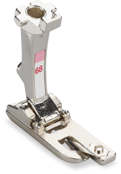 A scroll on the foot feeds the fabric edge from the front and turns it under twice, all in one operation. This produces a narrow, sturdy hem, which in combination with the corresponding stitch type creates the popular scalloped (or shell) hem. Roll and Shell Hemmer #68 is equipped with a 2 mm wide guide.