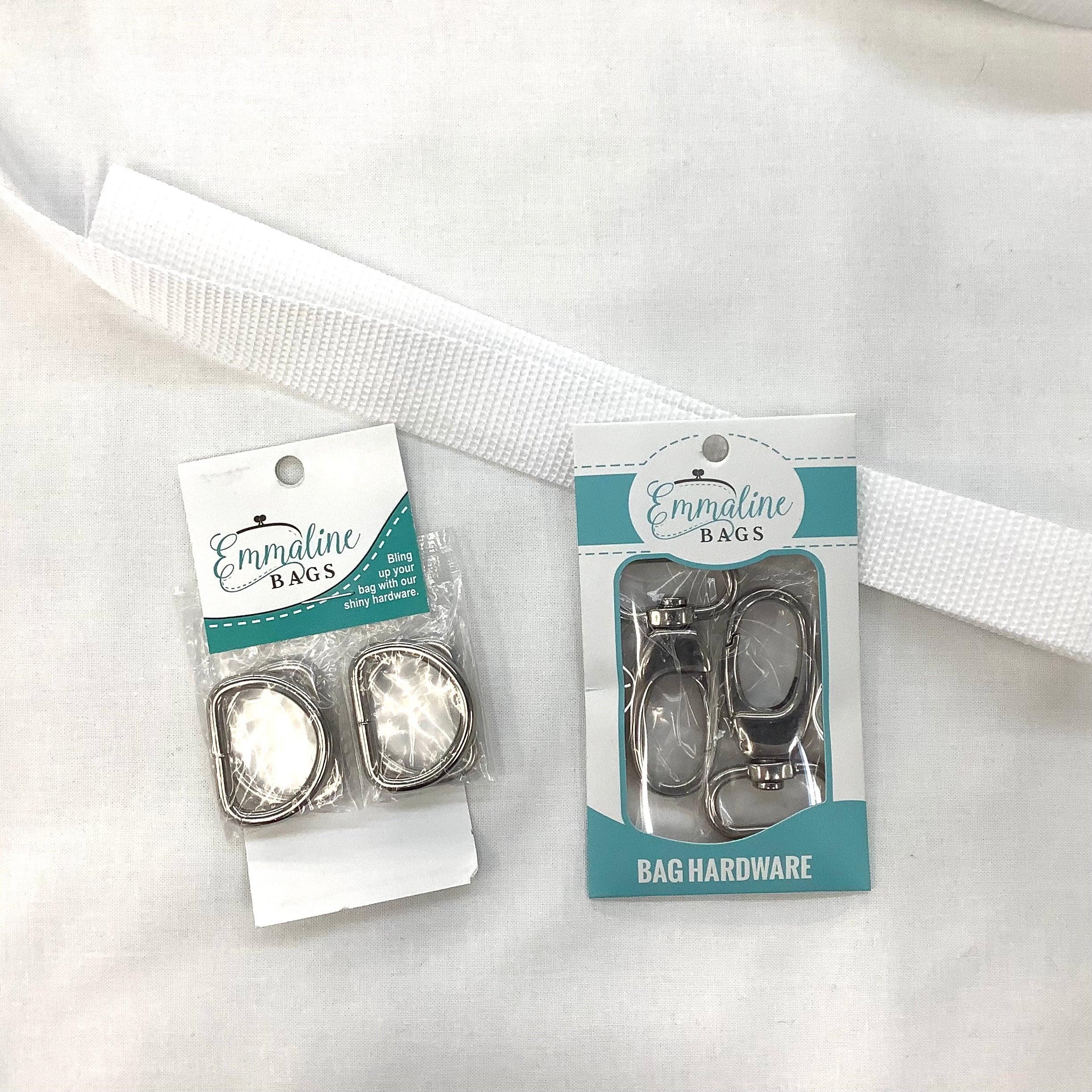 Add on the additional hardware kit of 3 swivel hooks, 2 d-rings in 1" size and one yard of strapping. You are all set to add the bag hacks to the Cosmetic Clutches pattern, being taught on Zoom starting in January 2026. This kit features Canadian Emmaline Bags hardware.