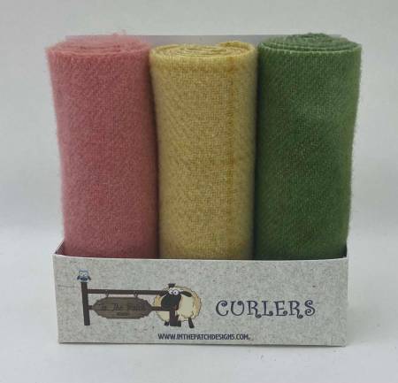 Curlers are 3 pieces of hand dyed felted wools that measure 4in x 16in each, rolled in a box ready to inspire more treasured projects.